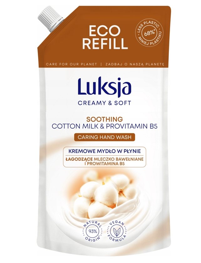 Delikatne, kremowe mydło w płynie LUKSJA Creamy & Soft z mleczkiem bawełnianym i prowitaminą B5 to idealny wybór do codziennej pielęgnacji dłoni. Duże opakowanie zapasowe 900 ml pozwala uzupełnić dozownik i cieszyć się ulubionym zapachem na dłużej.