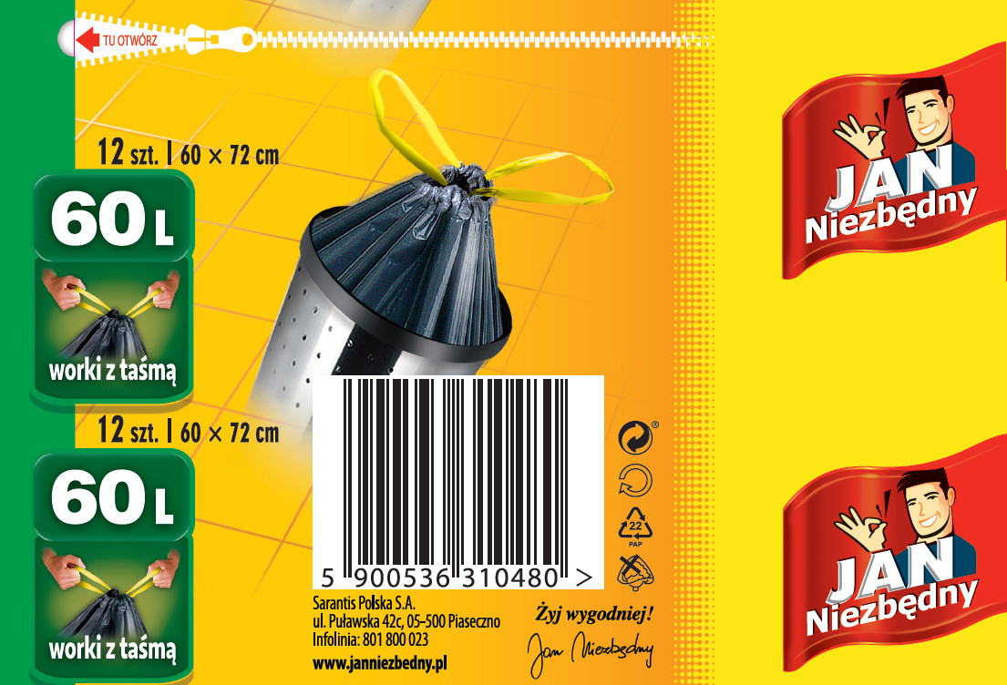 Worki na śmieci 60L (60×72 cm) 12 szt Jan Niezbędny z Taśmą Mocne Czarne
