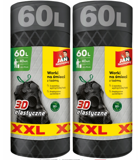Zestaw 2X Jan Niezbędny Worki Na Śmieci z Taśma 60L 40szt Wytrzymałe, 3 Warstwy Folii