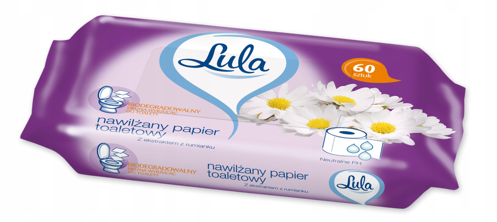 Poznaj komfort pielęgnacji każdego dnia! Lula to biodegradowalny, spłukiwalny nawilżany papier toaletowy z ekstraktem z rumianku, który: