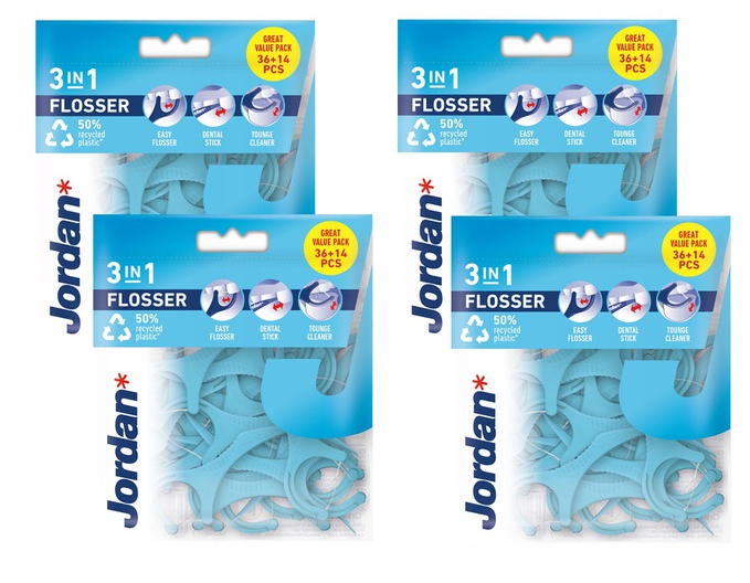 Zestaw 4X Jordan Flosser 3w1 – Nitka, Wykałaczka i Czyścik Języka– 50 sztuk