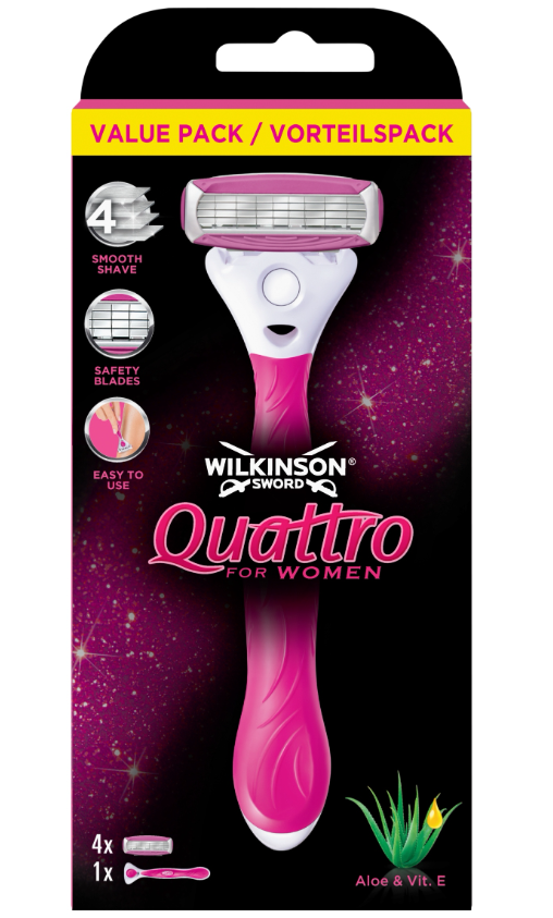 Odkryj gładkość i komfort golenia dzięki Quattro for Women od Wilkinson Sword! Ten praktyczny Value Pack zawierah 5 wymiennych ostrz oraz poręczną, ergonomiczną rączkę, dzięki którym Twoja skóra będzie idealnie gładka – zawsze i wszędzie.