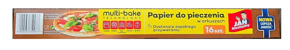 Praktyczny papier do pieczenia Jan Niezbędny w wygodnych arkuszach to niezastąpiony pomocnik w każdej kuchni. Dzięki technologii Multi-Bake Twoje wypieki i potrawy pieczone będą zawsze idealnie przygotowane – bez przypaleń i bez przywierania do blachy.